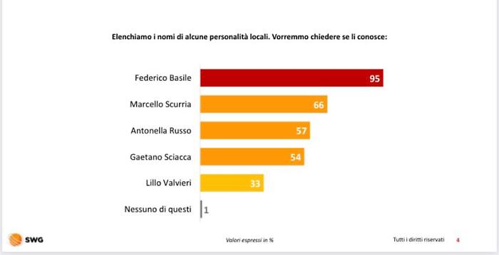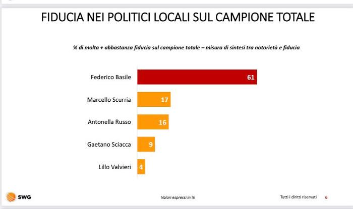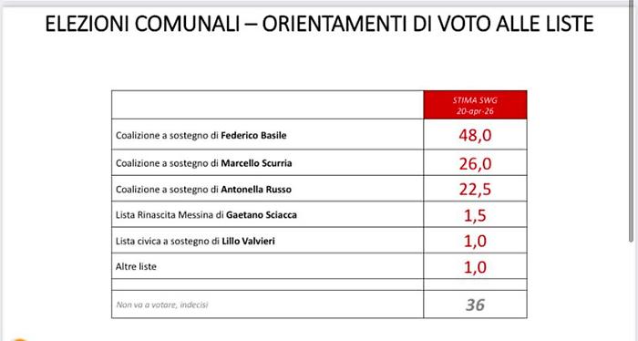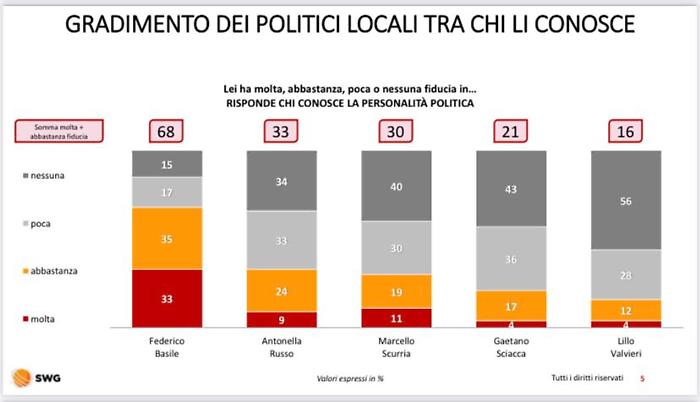Il centrodestra, raggruppato attorno a Marcello Scurria e sostenuto da Fratelli d'Italia, Lega e Forza Italia, si ferma a una forchetta tra il 23% e il 27%, mentre Antonella Russo, per l'area progressista (Pd e M5s), oscilla tra il 19% e il 23%. Analizzando la notorietà delle personalità locali, Basile è conosciuto dal 95% del campione, seguito da Scurria al 66% e Russo al 57%. Alla domanda specifica sul livello di fiducia tra chi conosce i candidati, il sindaco uscente svetta con il 68% di consensi positivi, distaccando nettamente la Russo al 33% e Scurria al 30%. Anche sul fronte delle liste il distacco è marcato: la coalizione per Basile è stimata al 48%, contro il 26% del centrodestra e il 22,5% del centrosinistra.