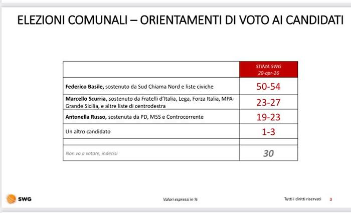 Ecco, dunque, pochi giorni dopo, tutti i dettagli del sondaggio, il cui risultato è netto: vittoria di Basile al primo turno. Questo è lo scenario politico che viene fuori dall'indagine statistica di Swg commissionato proprio dal partito di Basile, Sud chiama Nord, che configura un'egemonia netta per il candidato di Scn. L'indagine è stata condotta tra il 13 e il 20 aprile 2026 su un campione di 1.000 soggetti maggiorenni residenti a Messina, ha utilizzato una metodologia mista Cawi (Computer Assisted Web Interview) e Cati-Cami (Computer assisted telephone interview e computer assisted mobile interview), garantendo la rappresentatività per sesso, età e orientamento politico pregresso con un margine d'errore del 3,1%. In sostanza è stata un'indagine quantitativa condotta mediante una parte di interviste online (Cawi): in questo caso, si compila autonomamente un questionario strutturato che viene inviato tramite posta elettronica, link su siti web o pannelli (panel) di utenti registrati. L'altra parte con metodologie Cati (Computer assisted telephone interview) e Cami (Computer assisted mobile interview) che si riferiscono invece alle interviste effettuate per telefono. Nello specifico, il metodo Cati riguarda le chiamate verso utenze di rete fissa, mentre il Cami è focalizzato sui dispositivi mobili. Durante queste telefonate, l'intervistatore segue un questionario visualizzato sul computer, che permette di registrare le risposte in tempo reale.