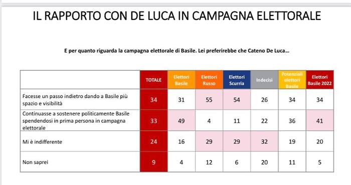 Basile, sostenuto da Sud Chiama Nord e liste civiche, si attesta su una stima di voto tra il 50% e il 54%. La solidità della sua posizione emerge chiaramente dalle risposte alla domanda sull'efficacia del suo operato, giudicato positivamente dal 72% degli intervistati, di cui il 33% lo ritiene molto efficace e il 39% abbastanza efficace.