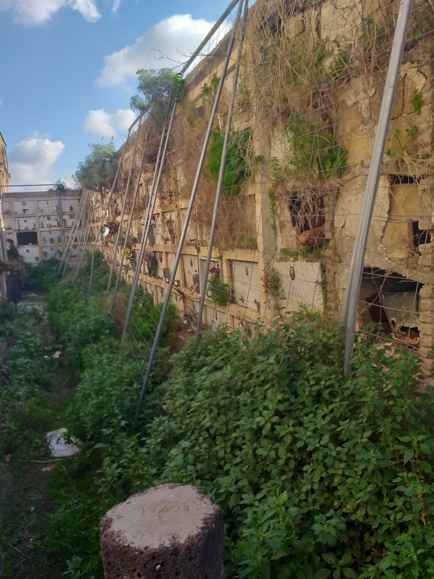 Il cimitero di Paternò è ridotto a uno scempio indegno. Loculi scoperchiati mostrano ossa in bella vista, i muri sono puntellati e minacciano un crollo imminente, mentre erbacce e sterpaglie invadono ogni angolo, trasformando i viali in un percorso impraticabile.