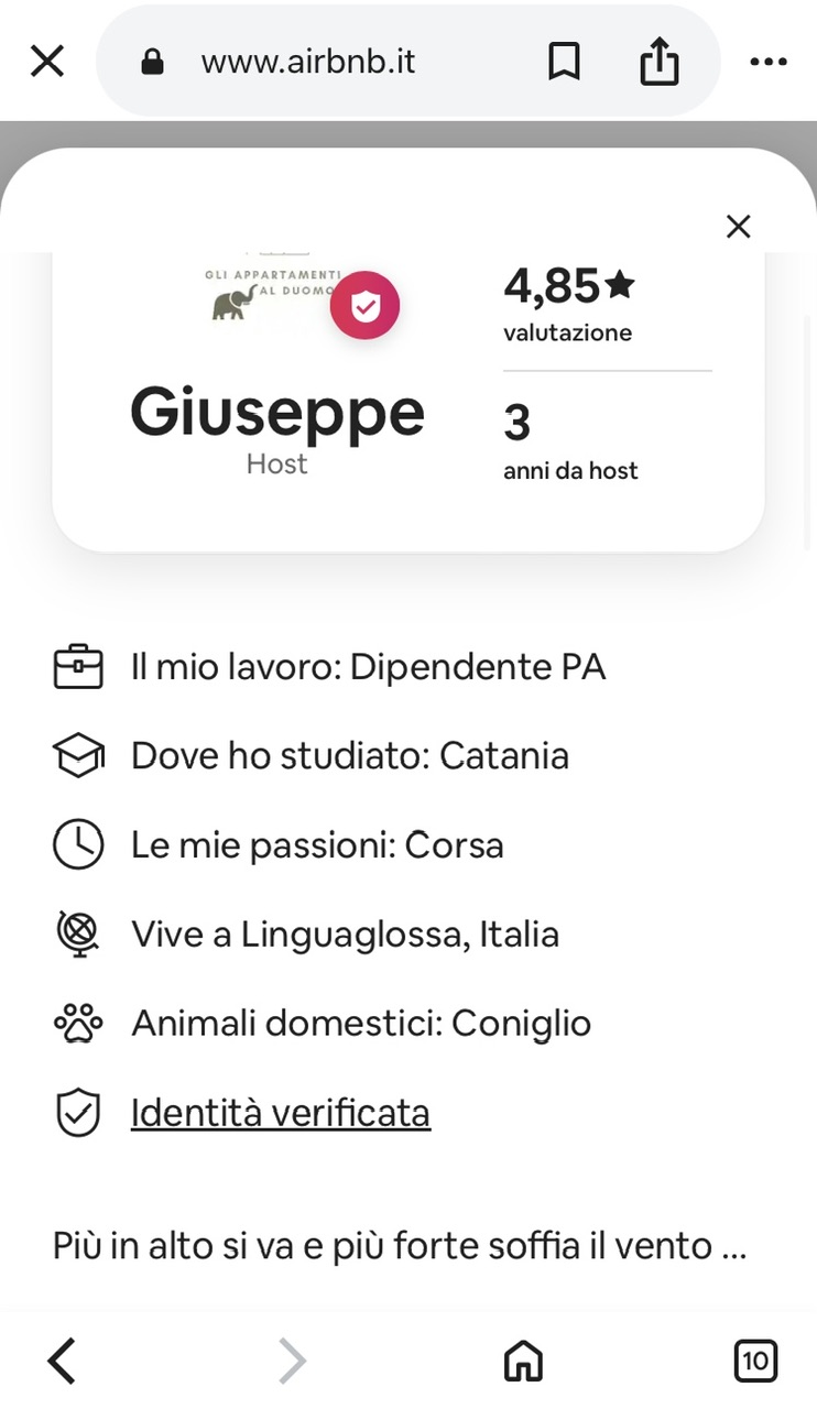 Fra l’altro, tornando sul caso specifico, proprio su Airbnb non ci è sfuggito il passaggio in cui viene riportata la citazione come “co-host” di un certo “Giuseppe” che si presenta così: “Il mio lavoro: dipendente PA (pubblica amministrazione, ndc); dove ho studiato: Catania; le mie passioni: corsa; animali domestici: coniglio”. Oltre alla frase “Più in alto si va e più forte soffia il vento…”. Ma in qualche caso, forse, c’è pure il rischio di bruciarsi le ali. Come Icaro.