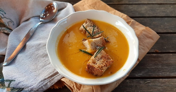 4) Vellutata di zucca, zenzero e rosmarino (senza panna), con topping croccante di ceci